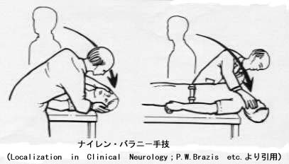 このめまいは頭の位置を変えた時にのみに起こる末梢性(内耳性)めまいです。 たとえば、ベッドで寝返りした時、起き上がった時や振り返る等、頭の位置を変えた時に急にグルグルと周囲が回転する激しい回転性めまいで吐気や動悸等、自律神経症状を伴います。 救急外来に救急車で運ばれてくるめまいの中でも、一番多いものです。 めまいを生じる頭の位置は決まっており、めまいの持続時間は30秒以内と短いものです。 中年以降の人に多く見られ、原因は不明ですが、過労等が誘因となっている患者さんが多い印象で、繰り返す人が多い様です。 めまいが生じている時、診察すると眼振(眼球の不随運動が上下、左右、または混合方向にリズミックに反復する。一般に急速に動く方向と緩徐に動く方向よりなり、急速に動く方向が眼振の向きと定義される。 水平性・垂直性・回転性眼振等と呼ばれる。)が認められます。 めまいが生じていない場合、発作を誘発するテスト(ナイレン・バラニ−手技)で診断ができます。 このテストは患者をベッド上で座位をとらせ、次に急速に後方へ